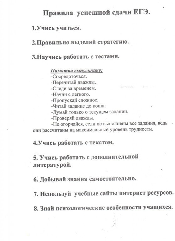 Для успешной сдачи ЕГЭ необходимо разработать индивидуальную стратегию подготовки и сдачи экзамена. Для этого необходимо учесть Ваши личностные особенности, которые Вы можете использовать для получения лучших результатов на экзаменах. Вы уже сдавали экзамены ранее, и сами можете оценить свои сильные и слабые стороны. За годы учебы к Вам могло прийти понимание своего уникального стиля учебной деятельности, включающее умение максимально использовать ресурсы собственной памяти, особенности мышления и работоспособности, а также уверенность в собственных силах и установку на успех.
